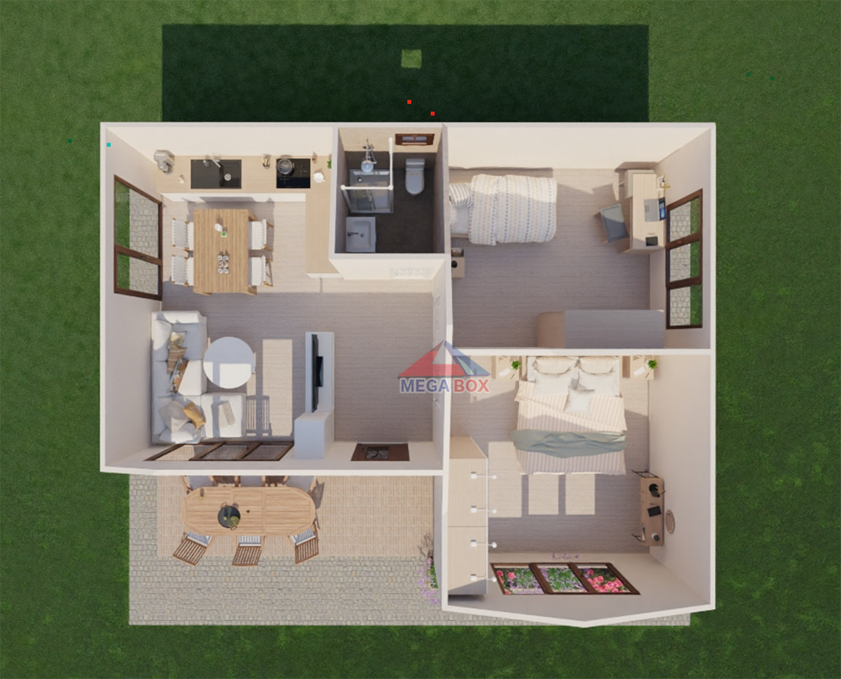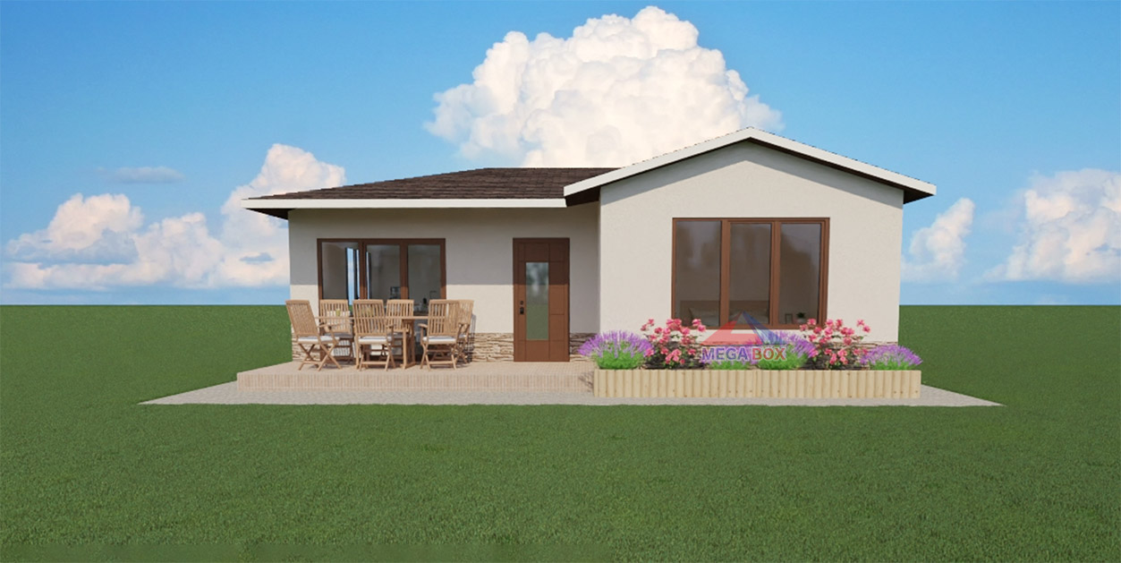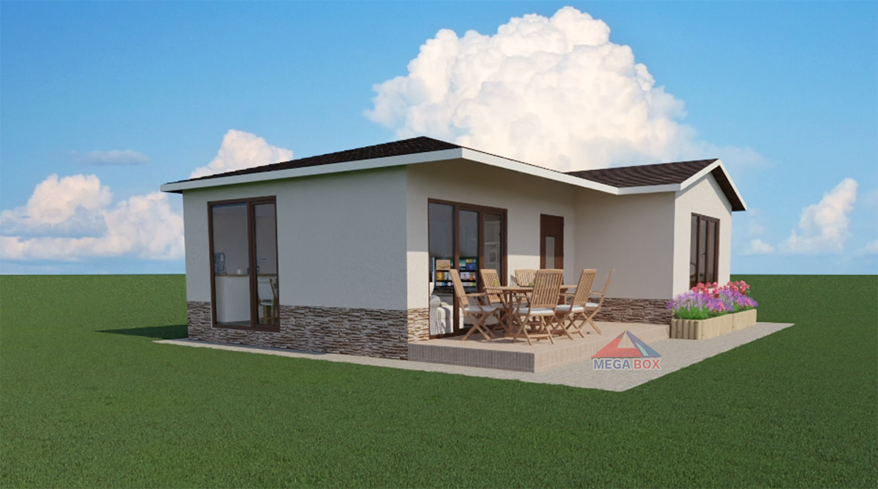 Външни стени: Каменна вата, влагоустойчиви плочи,(OSB), влагоустойчива дишаща мембрана,стиропор плътна 10-ка замрежване,шплаковка,полимерна мазилка