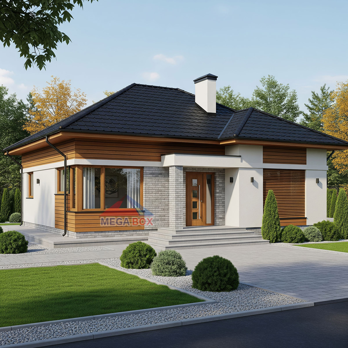 Външни стени: Каменна вата, влагоустойчиви плочи,(OSB), влагоустойчива дишаща мембрана,стиропор плътна 10-ка замрежване,шплаковка,полимерна мазилка